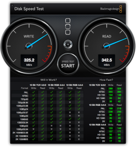 Les tests ont été mené grâce au logiciel type de benchmark de vitesse disque Blackmagic disk speed test, téléchargeable pour osx sur ce lien .